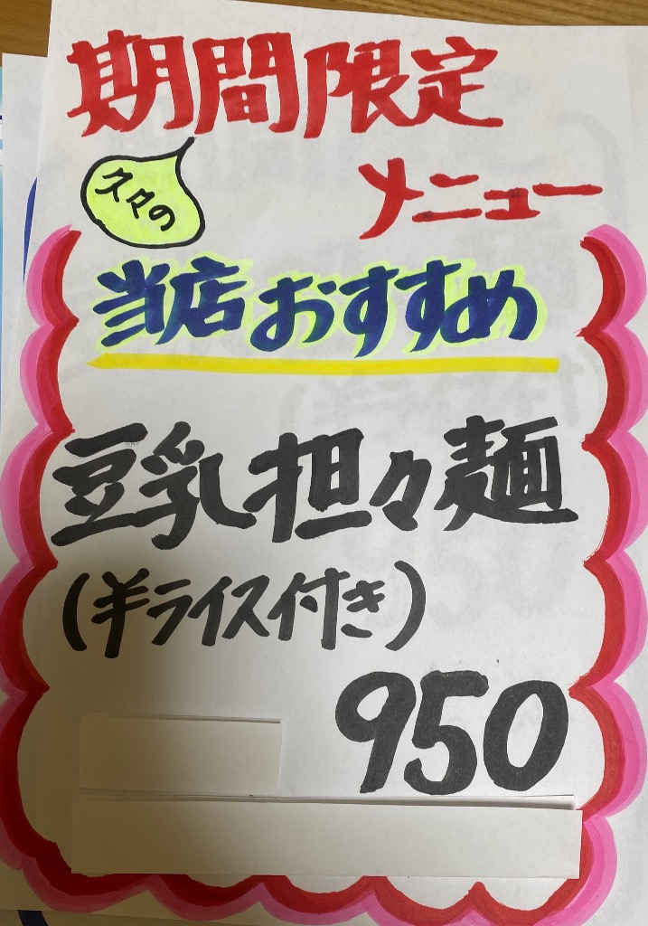 期間限定メニューで始めた豆乳坦々麺。大変ご好評いただいております。通常メニューの坦々麺とはまた一味違った美味しさです。寒いこの季節にぜひお試しください。950円(半ライス付き)です。画像は昨日のまかないです。