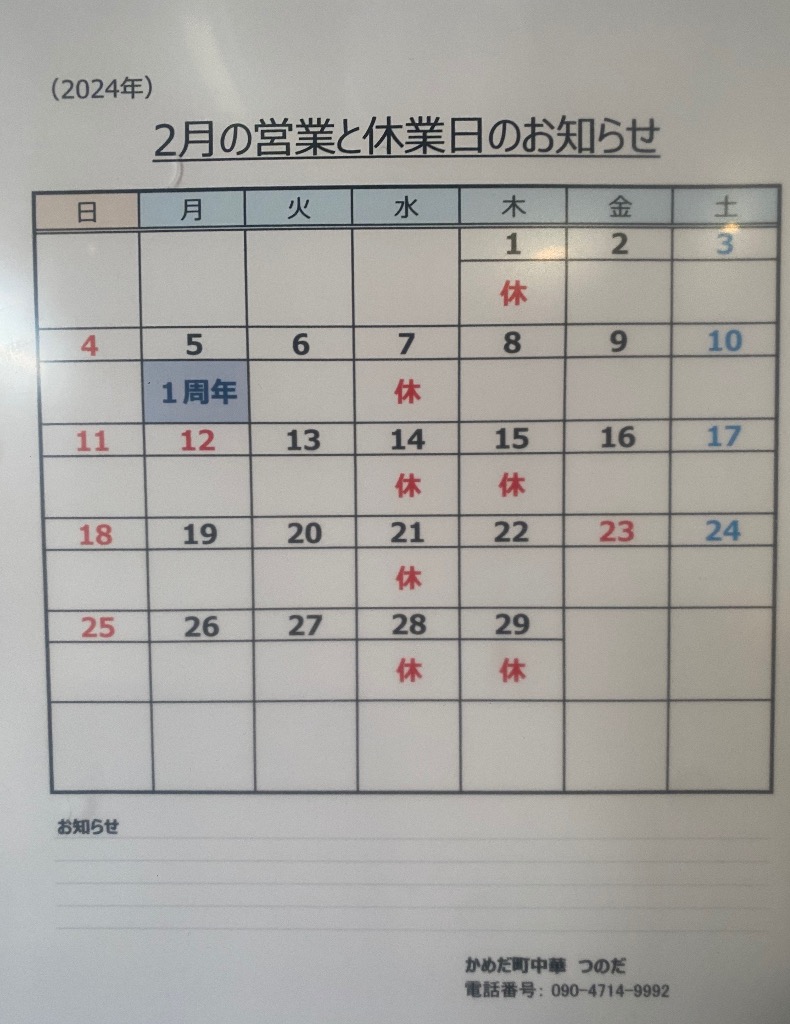 皆様、いつもありがとうございます。2月の定休日のご案内とおかげ様で2月5日に当店1周年を迎えます。感謝の気持ちを込めて、心ばかりではありますが、先着200名様に記念のプレゼントをご用意させて頂きますので、ぜひお待ち申し上げます。なお2月よりコース内容が少し変わるので、ぜひご参考頂けたらと思います。昼夜共にこれからも宜しくお願い致します。